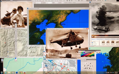 A view over my shoulder looking at the desktop of the Cintiq. Restoring old photos from the Korean conflict, creating detailed maps of places like Heartbreak Ridge, the Punchbowl, Inchon and the Pusan Perimeter for an upcoming documentary on KET. The title is Korea, The Forgotten War. After hours of immersing myself in this imagery, reading and learning the details behind some of these pictures and maps... Well, God Bless anyone who has ever served.